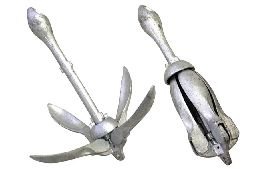 Ancoră clasică pentru umbrelă cu patru vârfuri (pisică de fier) din aliaj metalic turnat. Pliabilă, poate fi menținută fixă în poziție închisă și deschisă prin intermediul cercului de blocare, antipliere.